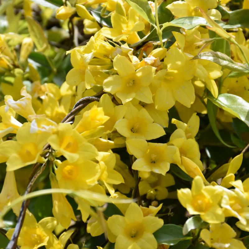 Carolina Yellow Jessamine has clusters of lightly-scented yellow trumpet-shaped flowers with gold throats along the branches from late winter to mid spring. It has dark green deciduous foliage. The pointy leaves do not develop any appreciable fall color.