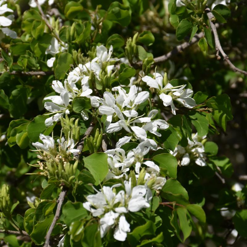 Anacacho Orchid Tree features showy clusters of white orchid-like flowers with pink overtones at the ends of the branches from late winter to late spring. It has attractive dark green foliage with grayish green undersides. The lobed palmate leaves are highly ornamental but do not develop any appreciable fall color.