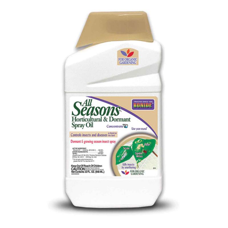 For organic gardening. A superior type of paraffinic oil that may be used as a growing season spray, dormant spray (no leaves) or delayed dormant (green tip) spray to control overwintering eggs of red spiders, scale insects, aphids, bud moths, leaf roller, red bug, codling moth, blister mites, galls, whitefly, mealy bugs and other insects and diseases. Highly recommended for use on fruit trees, shade trees, shrubs, ornamentals, roses, and vegetables.