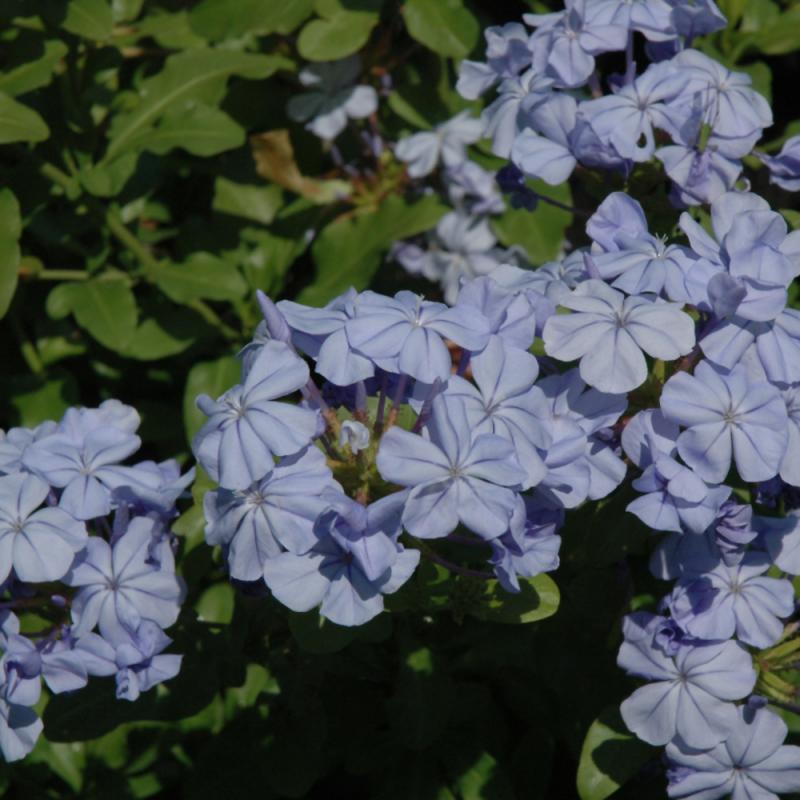 Dark Blue Plumbago features showy clusters of blue star-shaped flowers with navy blue stripes at the ends of the branches from early spring to late fall. It has dark green evergreen foliage which emerges light green in spring. The oval leaves remain dark green throughout the winter.