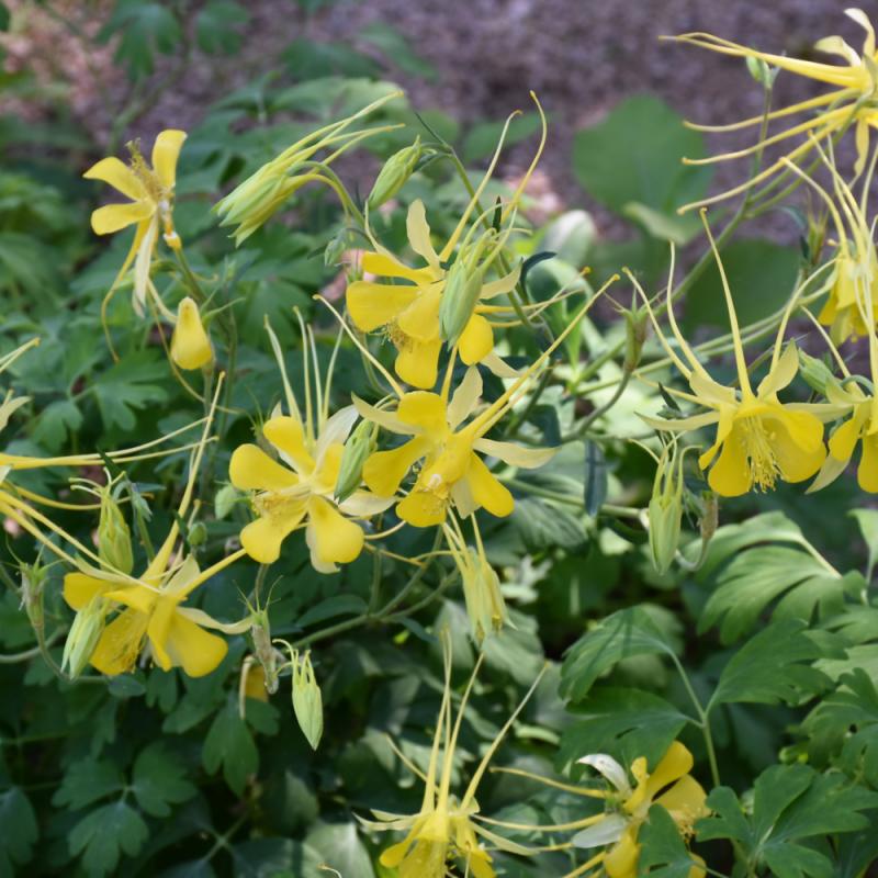 Texas Gold Columbine features bold nodding yellow bell-shaped flowers with gold spurs at the ends of the stems from early to late spring. The flowers are excellent for cutting. Its ferny compound leaves remain bluish-green in color throughout the season.