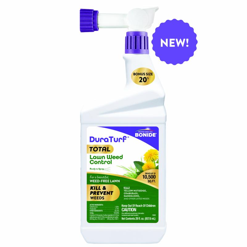 Kill and prevent weeds in your lawn with DuraTurf Total Lawn Weed Control Ready-to-Spray from Bonide. This selective herbicide provides both preemergent and post emergent control on a variety of listed weeds. Controlled weeds and grasses include crabgrass, dandelions, yellow nutsedge and many more. Intended for residential use only, this product can be applied to both cool and warm season turfgrasses. DuraTurf's fast acting formula provides visible results within days. This concentrated solution arrives ready to spray. To use, attach bottle to garden hose and apply evenly to affected areas. For best results and or full use instructions, please see product label.