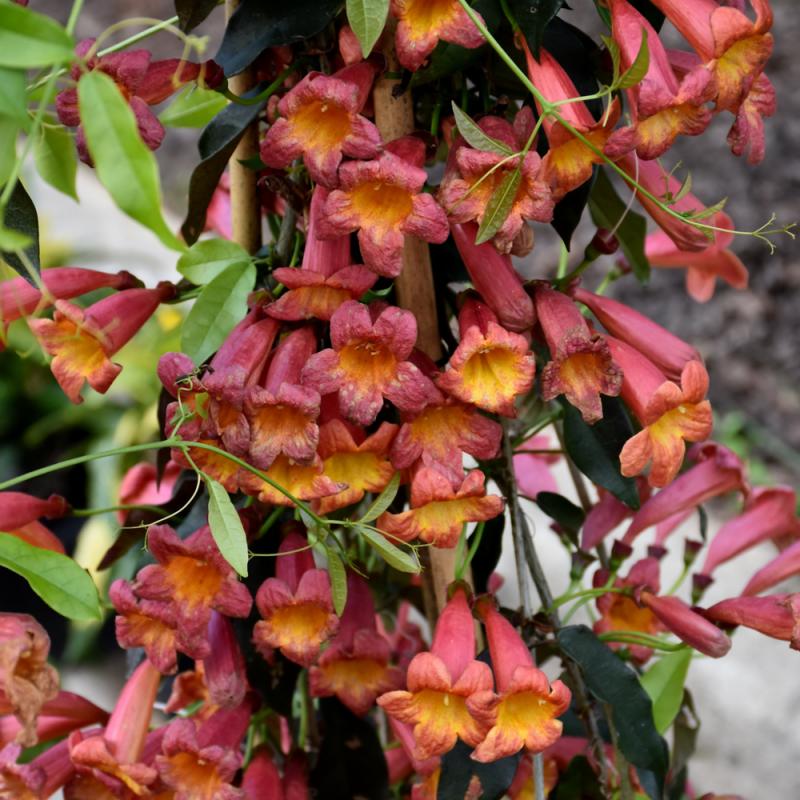 Tangerine Beauty Cross Vine features showy lightly-scented orange trumpet-shaped flowers with yellow throats along the branches from mid to late spring, which emerge from distinctive red flower buds. It has green deciduous foliage. The glossy narrow leaves do not develop any appreciable fall color. The fruits are showy brown pods displayed from late summer to early fall.