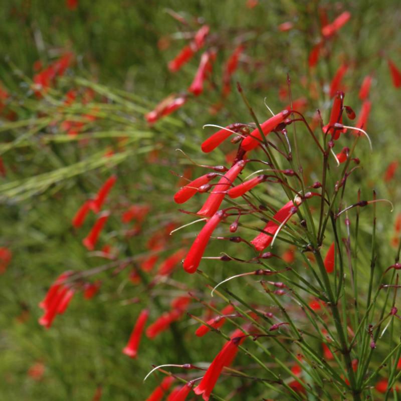 This sub-shrub is a weeping variety with very fine, grassy foliage, producing tall spikes of striking red-orange tubular flowers all season; prefers full sun and is drought tolerant once established; great for containers, and baskets; overwinter indoors.
