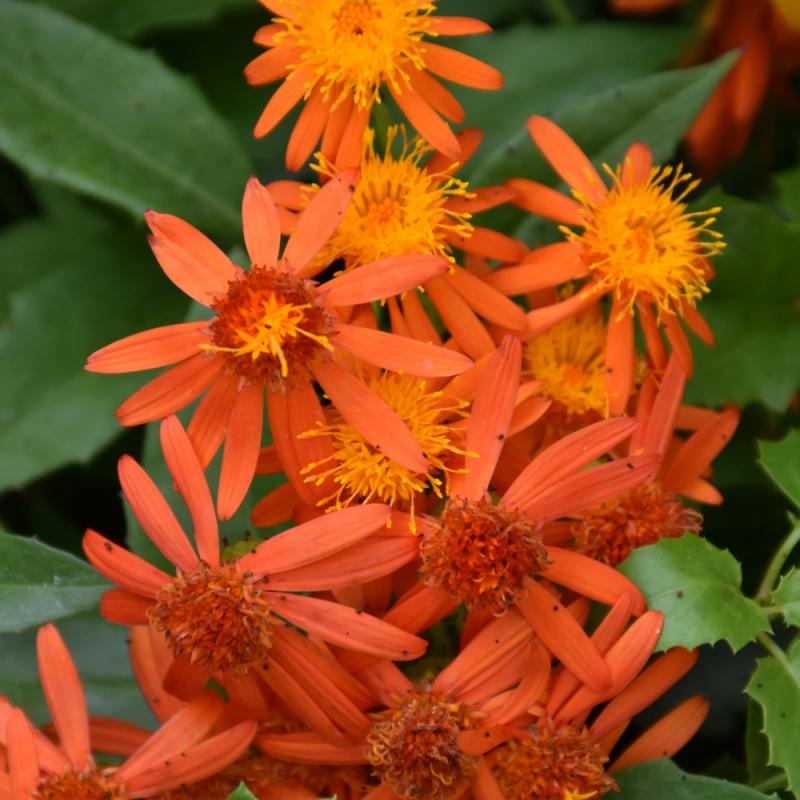 Mexican Flame Vine features showy clusters of scarlet daisy flowers with gold eyes at the ends of the branches from late spring to late fall. It has green evergreen foliage which emerges light green in spring. The serrated pointy leaves remain green throughout the winter.