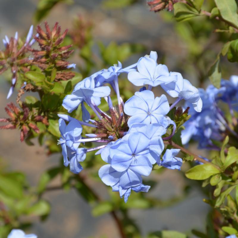 Imperial Blue Plumbago features showy clusters of sky-blue flowers at the ends of the branches from early spring to late fall. It has dark green evergreen foliage which emerges light green in spring. The oval leaves remain dark green throughout the winter.