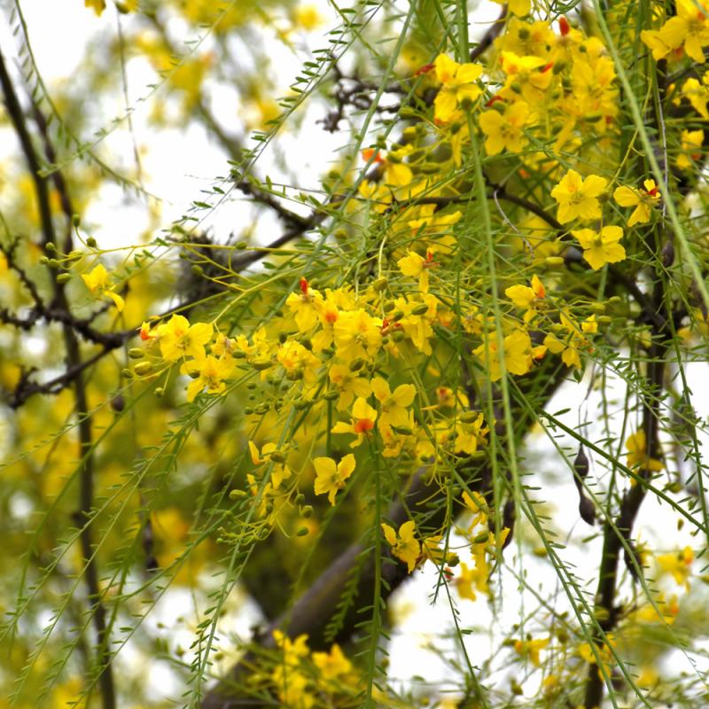 Retama features showy clusters of fragrant yellow pea-like flowers with a orange blotch at the ends of the branches from mid spring to mid fall. It has attractive green deciduous foliage. The tiny oval compound leaves are highly ornamental but do not develop any appreciable fall color. The fruits are showy brown pods displayed in late fall. The fruit can be messy if allowed to drop on the lawn or walkways, and may require occasional clean-up.
