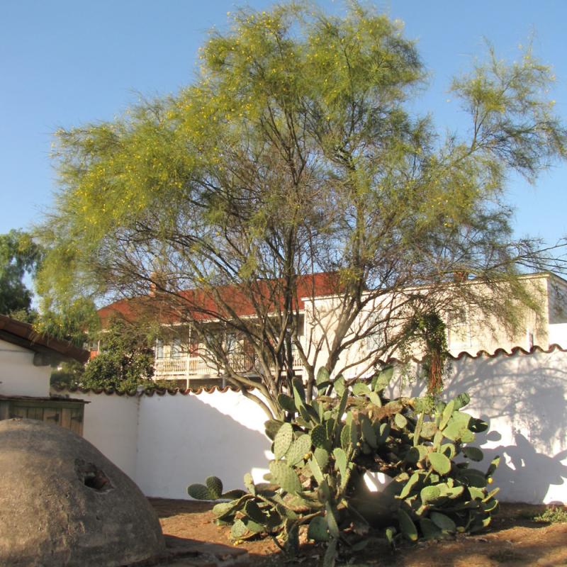 This spiny tree may have single or multiple stems, and can be maintained as a large shrub; deciduous in dry weather; fragrant yellow flowers with orange blotches in spring and fall; a lovely landscape accent for drier climate areas; protect from frost