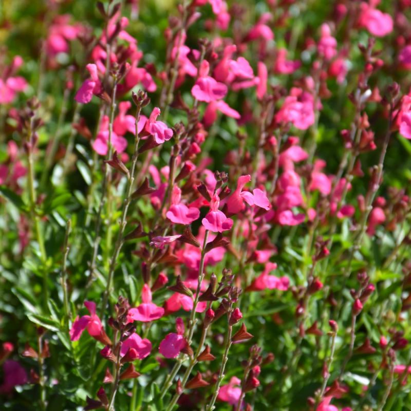 Pink Autumn Sage has masses of beautiful racemes of lightly-scented hot pink flowers rising above the foliage from late spring to mid fall, which emerge from distinctive red flower buds, and which are most effective when planted in groupings. The flowers are excellent for cutting. Its fragrant narrow leaves remain light green in color throughout the year.