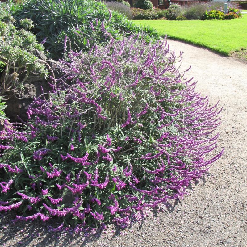 Mexican Bush Sage has masses of beautiful spikes of purple flowers with white overtones rising above the foliage from late winter to late fall, which are most effective when planted in groupings. The flowers are excellent for cutting. It has grayish green foliage with white undersides. The fragrant narrow leaves remain grayish green throughout the winter.