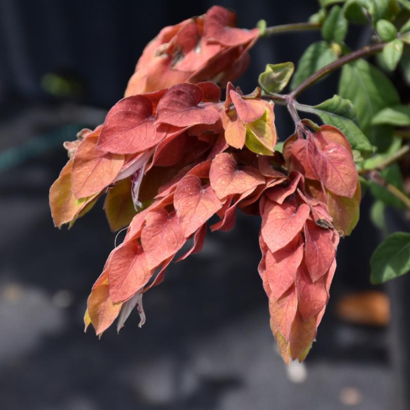Red Shrimp Plant features showy white tubular flowers with shell pink overtones and red bracts at the ends of the branches from late spring to early fall. It has green evergreen foliage which emerges light green in spring. The oval leaves remain green throughout the winter.