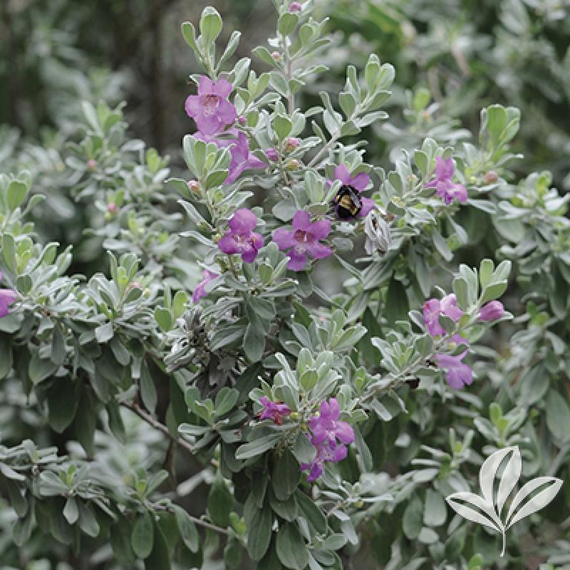 Slow growing dense growing shrub that tolerates heat drought and poor soils. Silvery foliage adds a nice contrast to landscape plantings. Pinkish tubular flowers appear in profusion usually after a rain. Can be used in mass or foundation plantings. Grows best in soils that are well-drained.